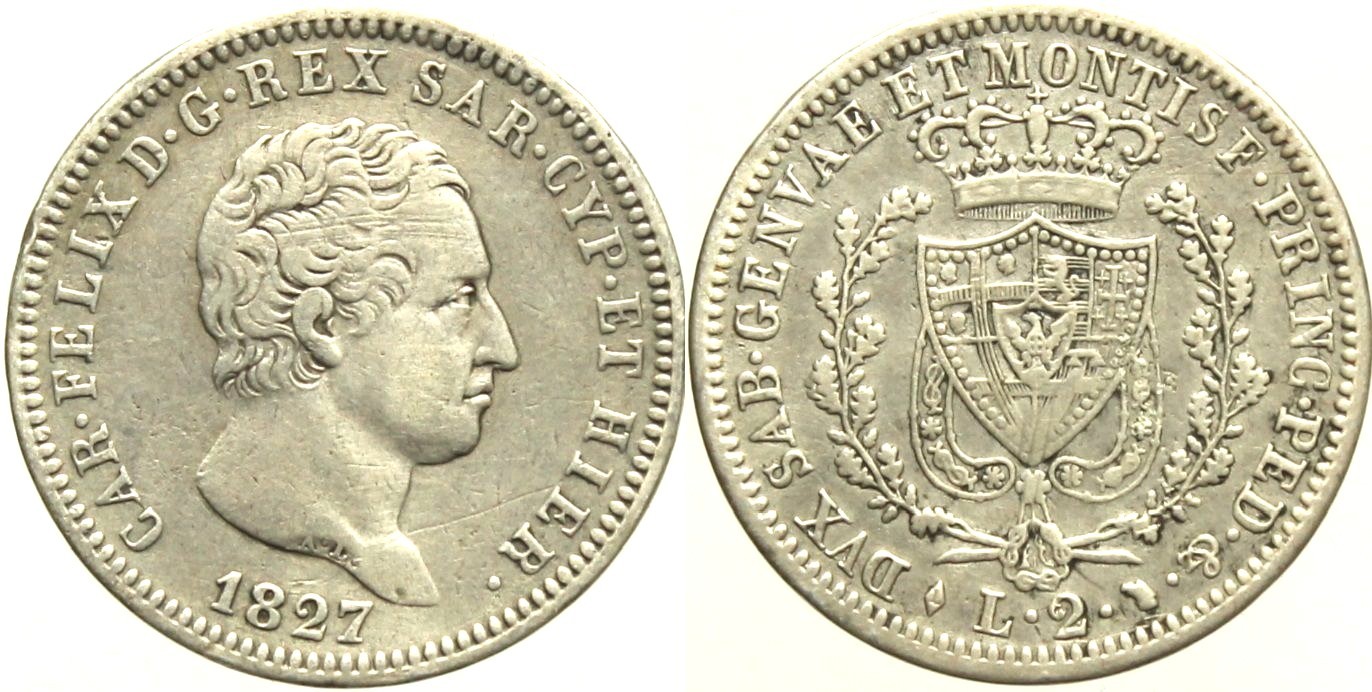 Casa Savoia - Carlo Felice - 2 Lire 1827 T BB - Rara Mir1036g Ag Silver